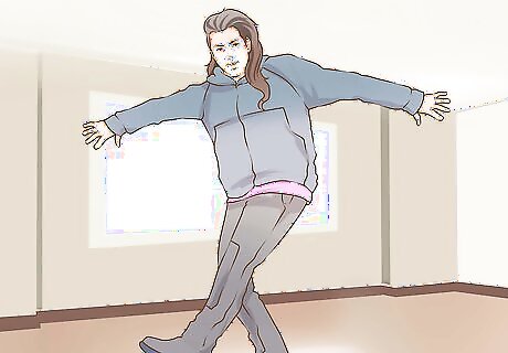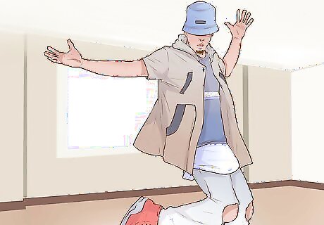 Master some of the basic moves of hip hop dancing. Once you understand the basics of popping and locking, you can learn a few basic hip hop moves that will get you started. These moves are the kind of things they'll teach you at almost any beginner's hip hop dancing class. Hip step: Start in the standard position with your feet shoulder length apart and knees slightly bent. Kick one foot out in front of you, then swing it to the outside of your other foot, crossing your legs. Then uncross your legs by moving your other foot back into standard position. Repeat in the other direction. Slide and step: From the standard position, move your feet closer together. Then step far to the side with one foot. Slide the other foot towards the first foot and then step it back into place next to the first foot. Then repeat in the other direction. Arm cross: Lean your torso forward a bit. Spread your arms in either direction, outwards but still pointing toward the floor. Then swing your arms both in and cross them in front of you. Move your hips back and forth to the beat as you do this.