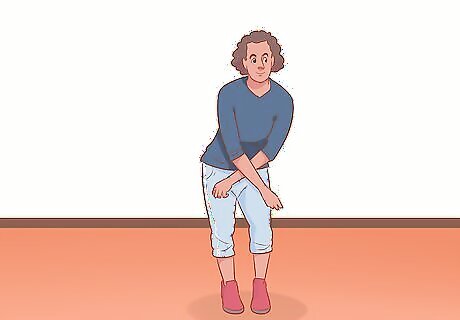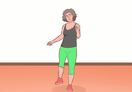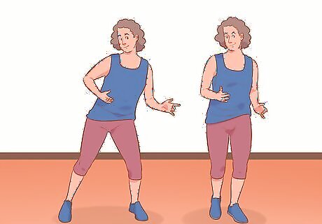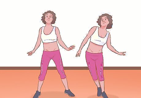Do a step-touch by alternating side-to-side steps with your feet. Stand with your feet shoulder-width apart, move your right foot a step to the right, then bring your left foot next to it. Then, move your left foot to the left and bring your right foot next to it. Keep your knees bent as you do this. When you practice this move, step to the right and left twice, alternating as you go.Tip: To help yourself stay in rhythm, clap your hands as your feet come together. Clapping is also a great way to keep your arms engaged.