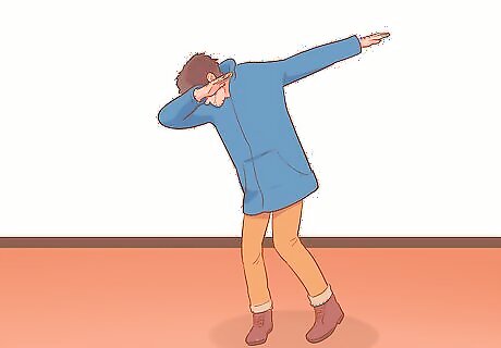 Mix in the dab for a simple, cool-looking dance move. This is one of the easier moves to learn and it only takes a few minutes to get it down. Start by lifting your arms out to your sides. Then, bend one arm and bring it towards your body like you’re about to sneeze into it. Tuck your head down towards the bent arm while keeping the other arm straight and jolt your head into your elbow once. You can switch arms once you’ve dabbed into one arm. As you dab with your upper body, try moving around your lower body at the same time. You can slide back and forth, hop around, or wiggle your hips.