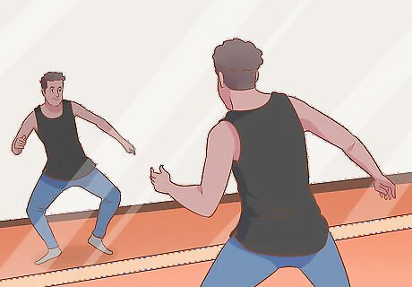 Work on the basics at home in front of a mirror. Dancing in front of a mirror lets you analyze your moves as you do them to make sure you look sharp and confident. Put on some rap music and practice each move individually to really nail the basics. Some artists to listen to include Busta Rhymes, Outkast, T.I., Eve, and Timbaland. While you should spend time practicing without music to focus on getting the basics right, dancing to music allows you to get better and moving your body to a specific rhythm.