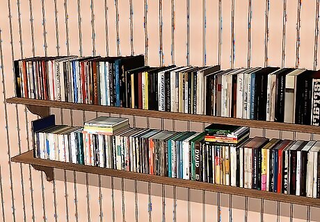 Line the walls with bookshelves to hide most of the wood. Wood paneling serves as an excellent background for standard bookshelves—especially if they're made out of a solid color. The wood grain will surround the solid bookshelves and make them pop visually without making the walls feel empty. If you want to incorporate the wood itself, find wall shelves with a similar grain and install them along the wood-paneled walls. If you don't have enough books to cover the shelves, you can use records, trinkets, or candles to fill in the empty spaces.