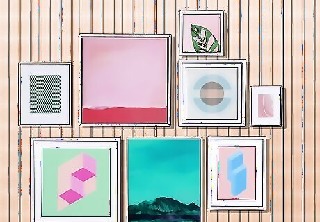 Create a gallery wall to completely obscure the paneling in art. A gallery wall refers to a wall that is completely covered in art, with only 1–2 inches (2.5–5.1 cm) of space between pieces. Create a gallery wall by lining up a bunch of art on your floor in a pattern that reflects the size of your wall. Hang each piece using nails and a hammer. A gallery wall is an excellent choice if you have a ton of art that you can hang and need to cover a few accent walls. Gallery walls are a great way to hang personal photos as well. If you have a bunch of older photographs, a gallery wall is the perfect way to incorporate them in your decorations without making the rest of the art in your home feel out of place.