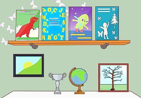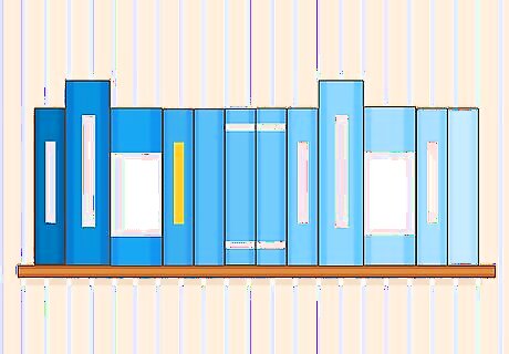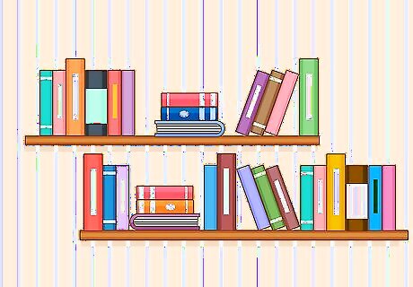 Stack books vertically and horizontally. Books don’t all have to be lined up horizontally along a shelf. Create a vertical stack of two or three books and place it beside your lined up books to create some variation along the shelf. This will create visual interest and reduce the number of books you need to buy. The vertical stacks can also serve as bookends to hold the others upright.