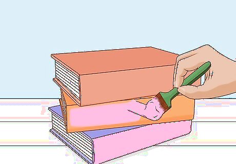 Change the color of books with paint or burlap. If you want all your books to match each other or your decor, brush the covers lightly with paint and then hang them up to dry. Or wrap them with burlap or wallpaper and glue the material to the inside of the cover.