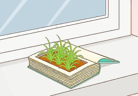 Cut a hole in a book to make a planter. Hollow out a book by gluing the pages together, drilling a hole in each corner and using a box cutter to cut the center of the pages out. Pop a shallow plastic container inside to hold a plant, then place your book planter in a windowsill.
