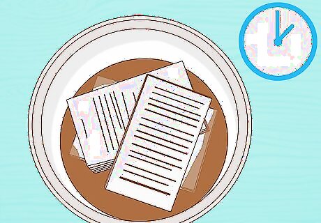 Age new books by soaking them in coffee. If you want the aged book look without spending any money, find a book you don’t mind deconstructing. Remove the cover and soak the pages in a bowl or bucket of brewed coffee for a couple hours. Hang the book to dry in the sun, then display it once it’s dry.