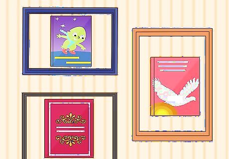 Frame books on the wall. Hang an old paperback book on the wall by piercing the back several pages and back cover with thumbtacks. Surround the book with an oversized vintage-looking frame that has the glass removed. Group several of these framed books on the same wall for a bigger statement.
