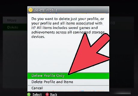 Delete the profile. Select the profile that you want to delete and press the A button. A new menu will open with a Delete option. When you press Delete, you will be given two choices. You can delete the profile only while continuing to store the save games and achievements, or you can delete the entire profile and all associated data. If you just received the Xbox and are deleting the accounts of users who won’t be using the machine anymore, delete all the data to make more room for your own.