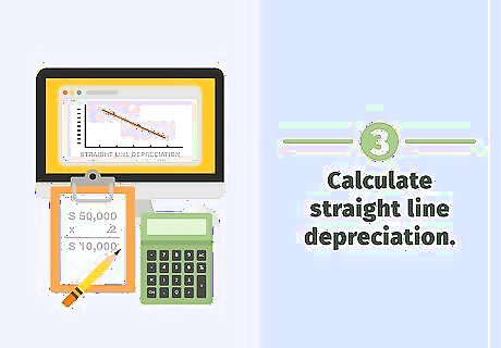 Calculate straight line depreciation. Calculate the net cost of the asset by subtracting the salvage value from the cost. Calculate a depreciation rate using the useful life in years. Multiply the cost of the item the depreciation rate to calculate the annual depreciation amount. For example, suppose a company purchased a vehicle for $60,000 and the vehicle has a $10,000 salvage value and a five-year useful life. Calculate the depreciable asset cost with the equation $60,000 - $10,000 = $50,000. Divide the useful life (in years) into 1 to calculate the depreciation rate. Use the equation 1 / 5 = .2. The depreciation rate is 20 percent. Multiply the depreciation rate by the depreciable asset cost to calculate the annual depreciation amount. Use the equation $50,000 x .2 = $10,000. The company will record $10,000 of depreciation on the vehicle every year.
