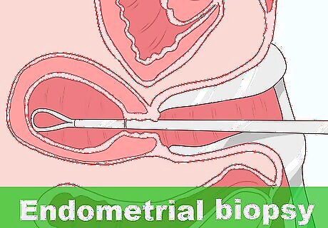 Have an endometrial biopsy done. An endometrial biopsy is the most commonly used tissue sampling procedure used to detect uterine cancer. If your doctor sees an abnormality during imaging tests, they will likely suggest having a biopsy done. During the biopsy, your doctor will insert a flexible, thin tube into your vagina, through your cervix, and into your uterus. The tube uses suction to remove a very small amount of endometrium tissue from your uterus. You may experience slight discomfort, similar to menstrual cramps, during this procedure. Because of this, take a non-steroidal anti-inflammatory drug, like ibuprofen, before the procedure to reduce any discomfort. Once the sample is collected, your doctor will have it examined by a pathologist.