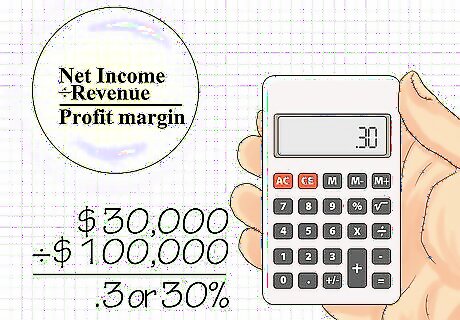 Divide your net income by the total revenue you already calculated. The resulting percentage is your profit margin, which is the percent of your revenue that you keep as income. In our example above, our difference was $30,000. $30,000 ÷ $100,000 = .3 (30%) As a further example, if your business sells paintings, the profit margin calculation tells you on average, when a person pays for a painting, how much of that money you will keep in profit.