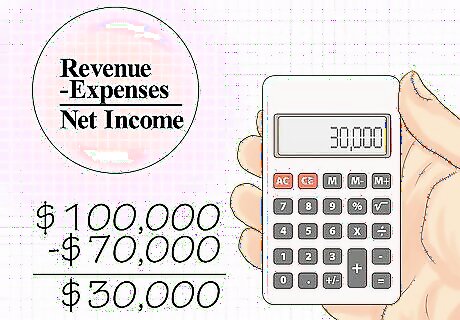 Subtract all your expenses to calculate your net income. Expenses are the opposite of revenue. They're any amounts you have had to pay, or will pay in the future for things you did and/or used during the calculation period. This includes expenses incurred to operate as well as the expense required to carry investments. Common expenses are the cost of labor, rent, electricity, equipment, supplies, inventory, banking, and interest expense on loans. Generally if you run a small business you can just add up everything you paid for during the period. For example, if your business earned $100,000 in revenue during the calculation period, and in order to earn that revenue the business spent $70,000 on rent, supplies, equipment, taxes, and interest payments, you subtract $70,000 from $100,000, your remaining revenue after expenses was $30,000.