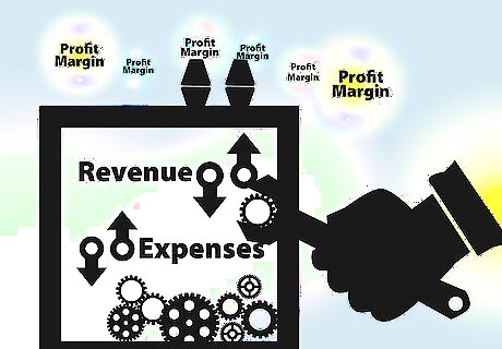 Adjust your profit margin if necessary. You can change your profit margin percentage by making more revenue (such as by increasing the price of your products or selling more of them), or by reducing the expenses associated with your business. Also, even if your profit margin remains the same, if you increase your total revenue and expenses, your net income will increase in dollar value. Consider your business, competition, and risk tolerance as you experiment with raising prices or cutting costs. Generally you should make small changes and work up to larger ones to prevent a dive in business or angering your customers. Remember that there is a cost to increasing your profit margin, and doing so too aggressively can have the reverse effect by tanking your business. Don't confuse profit margins with markup. Markup is the difference between what something costs to produce and how much it is sold for.