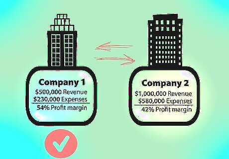 Compare your profit margin to other similar businesses. Another useful aspect of knowing your profit margin is comparing it to similar businesses to determine where you stand. If you are applying for a loan, the bank will likely tell you what kind of profit margin they expect for your size and/or business type. If you are a larger company with competitors, you can likely research those companies and learn their profit margins to compare them to yours. Say that Company 1 has revenue of $500,000 and total expenses of $230,000. This would give it a profit margin of 54%. Assume that Company 2 has revenue of $1,000,000 and total expenses of $580,000. This means that Company 2's profit margin is 42%. Company 1 has a better profit margin, even though Company 2 makes double of what Company 1 does and has a higher net profit.