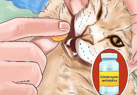 Give your cat antibiotics. Your vet will most likely prescribe an antibiotic in the form of a pill. In order to administer the antibiotic, open your cat’s mouth and quickly place the pill in the back of its mouth. Do not let your cat go until the pill is swallowed. Reward your cat with a treat afterwards for good behavior. Give your cat the correct dosage per your vet’s instructions, and make sure to finish the entire course of antibiotics. Antibiotics such as Clindamycin, pyrimethamine, and sulfadiazine are typically used to treat toxoplasmosis.