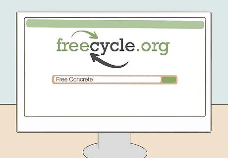 Use Freecycle to give away your concrete. Freecycle is a website and network of people who give away things for free to people who are interested in taking them. You can create a post for your concrete and if someone is interested in taking it, they’ll contact you about it. You can arrange a pick-up or delivery of the concrete and it’ll be used by somebody who wants it. Visit https://www.freecycle.org/ to create a post to give away your concrete. Freecycle doesn’t make a profit and they’re a great way to keep your unused concrete out of a landfill.Tip:Find a local Freecycle group so you can give the concrete to someone in your area.