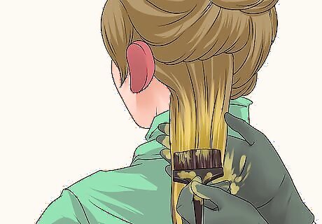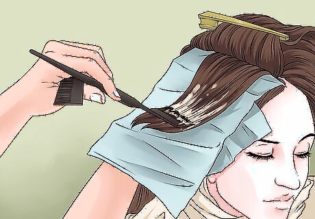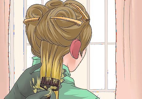 Use small clips to section off hair. Follow the movement of your layers to act as a guide to applying the dye. If you’re at home and using packaged dye, follow the instructions and timing correctly to ensure your best color result. Apply petroleum jelly on your hairline, around your ears, and at the base of your neck to keep dye off of your skin. Wear protective gloves to further prevent staining your skin. Prevent staining by using a towel over your shoulders. Do not wash your hair the day of dyeing your hair, to help your scalp keep its oils and its moisture. Use a water bottle to dampen your hair and promote even coloring.