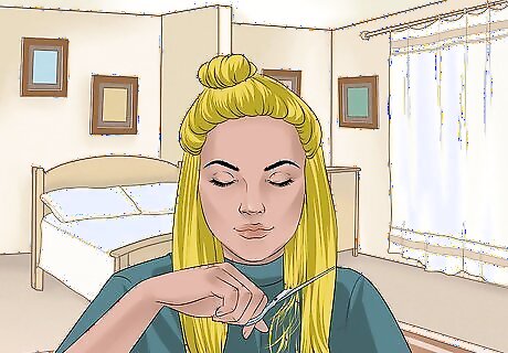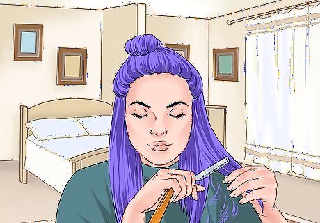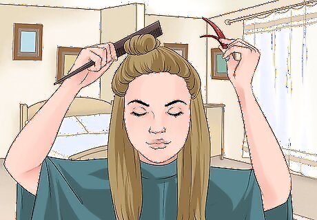 Part your hair. Using a comb, separate your upper layers of hair from your lower layers, around the level of your ears. Tie this hair up and away, so that you can more easily access the lower layers. You may also wish to divide the lower section of hair into three parts: left, right, and back. Large clips can be used to keep the mass of your hair on top of your head and away from the areas you are cutting. This will help ensure that you do not accidentally cut the upper layers while you are working on the lower layers.