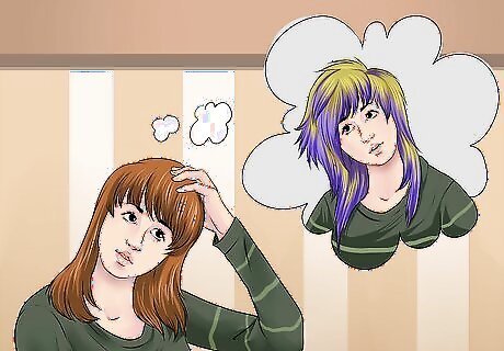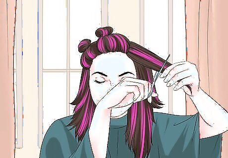 Add in extensions. Colorful extensions can be purchased and placed to give your a hair a multicolored look. These can be woven into your hair or function like clips, hidden by the layering. It depends largely on how nice you want them to look, how permanent you want them to be, and how much money you want to spend. Woven extensions are usually placed by a hair stylist and cost more money. They are also more of a long-term commitment. Clip on extensions, however, are cheaper and can be switched out whenever you want. Popular colors for the highlights and extensions include pink, green, blue, and bleach blonde.