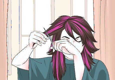 Start with temporary hair colors. This gives room for mistakes and allows you to learn what colors you like for your cut and style. It is also less harsh on your hair than permanent dyes so it promotes less damage to your hair. Once you’ve decided on something permanent, go to a colorist to achieve a more permanent version of your look in the least damaging way possible. You can have the entirety of your hair one color, have the lower section a different color than the upper section, or you can have single strand highlights. Get creative! Popular scene hair colors for the main section of your hair include bleach blonde and dark brown/black but whatever color you like best is fine. You can also keep your entire hair your natural color if that is more to your liking. Natural-colored hair dyes can easily be purchased at grocery stores, while other colors may require you to go to specialty shops. You can always have your hair colored at a salon as well.