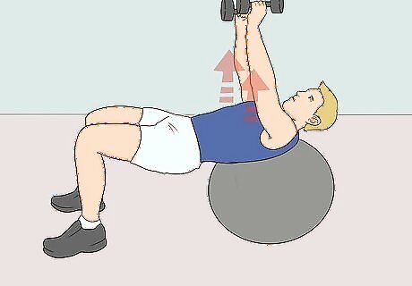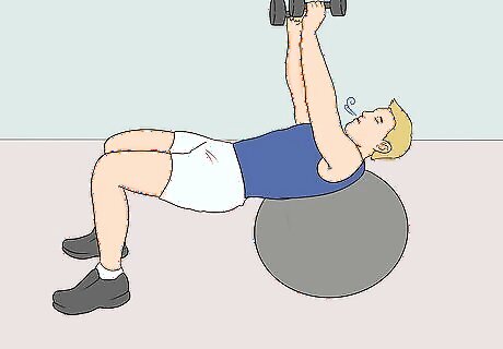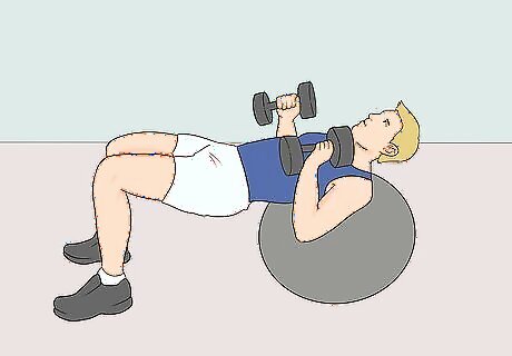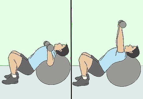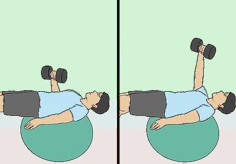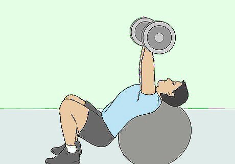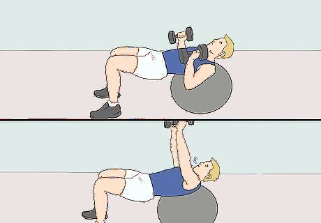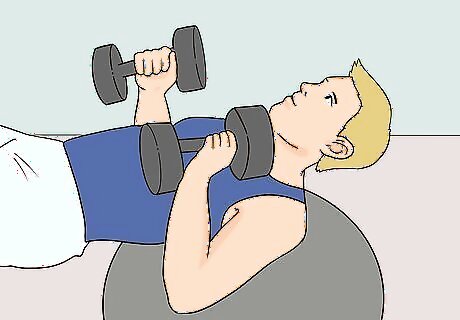 Do incline balance ball dumbbell presses to focus on your upper chest. Sit on the balance ball with dumbbells in your hands and walk your legs out until your body is at a 45-degree angle to the floor. Press them straight up until they are above your head, then lower them back down and repeat the motion. Incline presses will work your upper chest and shoulders more than flat presses. Doing them on a balance ball will also work your middle back because you will be using it to balance against the ball. You can also perform the one-armed variation of incline presses to make them even harder by isolating one side at a time. Hold the dumbbells with your palms facing each other, or with your thumbs facing behind you to perform the incline presses. Keep your knuckles facing the ceiling.