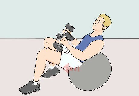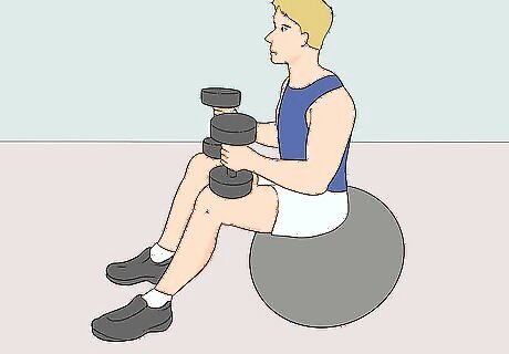 Sit on a balance ball with a dumbbell in each hand. Place the ball on a hard floor in an area where you will have enough room to lie down on it comfortably. Sit with your back straight and the dumbbells resting vertically on your knees.Tip: Start out with a light weight that is easy for you to lift so you can practice your form while balancing on the ball. Move up to a heavier weight when you are comfortable performing the exercise. Balance balls are also known as Swiss balls, gym balls, or stability balls. You can start with the dumbbells in your hand, or sit down first and then grab them off the floor. Do whatever is most comfortable for you. Make sure that both feet are planted firmly on the ground.