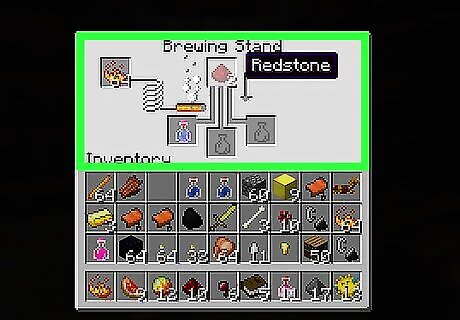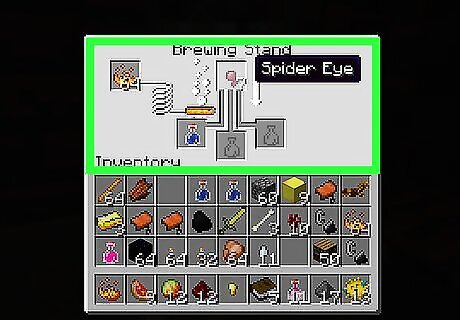 Collect the other supplies: Redstone (Found underground around diamond and lava level, in which each ore yields 4-5 redstone dust. You may also kill witches which drop 0-6 redstone at a time.) Fermented Spider Eyes (Created by placing a brown mushroom, spider eye, and sugar in a crafting table.) Sugar (Crafted by placing a sugarcane in a crafting table; sugarcane is found in shorelines along rivers, beaches, and lakes.) Glistering Melon (Crafted by surrounding a melon with golden nuggets in a crafting table.) Spider Eye (Dropped by spiders, cave spiders, and witches.) Ghast Tear (Dropped by ghasts in the Nether.) Golden Carrot (Crafted by surrounding a carrot with golden nuggets.) Pufferfish (Obtained by fishing.) Rabbit's Foot (Rare drop from a rabbit.) Dragon's Breath (Optional, dropped by the endgame boss known as the Ender Dragon.) Gunpowder (Dropped by creepers when killed; can also be dropped by witches.) Magma Cream (Dropped by magma cubes in the Nether.)