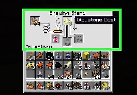 Customize the potions in other ways if desired: Add glowstone dust to most potions to increase their power of effect. For example if you add it to a Harming Potion, if it upgrades to a Harming Potion II using glowstone dust it will do more damage. Add redstone to increase the time of effect of a potion. Add gunpowder to transform the potion into a Splash Potion, which is effective since it is thrown instead of drank, making it easy to use it in combat. Lingering Potions are made by combining Dragon's Breath and Splash Potions. Lingering Potions can be thrown and will stay and give the effect it provides to anyone in range of the area of effect; it will stay for a long time, making it useful for PVP and giving buffs to your team when playing UHC's or Survival Games. It is also used to create tipped arrows.