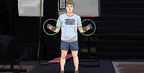 Move your arms as little as possible while doing the lunge. Your left arm should maintain the same downward position as your body shifts during your lunge to the right. Your right arm will extend outward a little as it is guided by the movement of your right hip and outer thigh. Keep the weight in your right arm snug against your right hip and outer thigh. It will slide down your leg as you lunge, then back up to your hip as you return to the starting position. Another option is to hold the weights in the position for hammer curls. Turn the weights so that they are vertical rather than horizontal.
