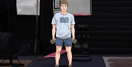 Start with small hand weights in each hand. Begin with dumbbells that are 5 lb (2.3 kg), which is a good starting point for doing side lunges, or go lighter as needed. Over time, you can move up to heavier hand weights. If you start with weights that are too heavy, you may lose your balance, strain your leg muscles, injure your shoulders or back, or drop the weight on your foot! Using hand weights while doing side lunges increases the effort required by your upper leg muscles, thereby increasing each lunge's value as a strength training exercise.
