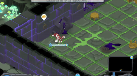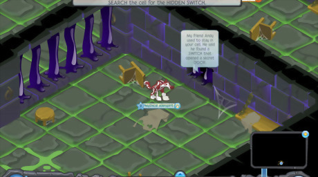 Free yourself from the cell. Move all the way to the locked door of the cell. When you get close enough, a paw print icon will appear, representing the secret switch. Click on it and the door will open.