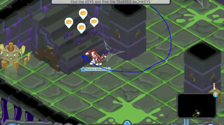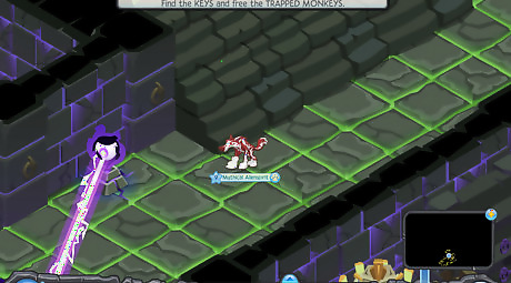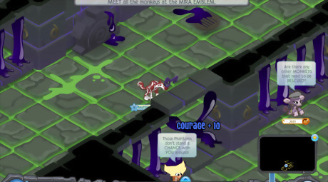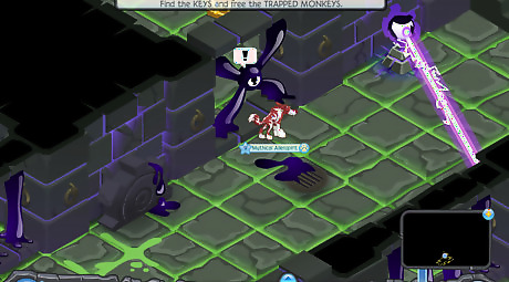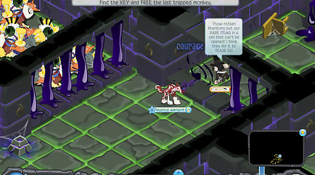 Enter the dungeon. Go through the dungeon and you'll find several locked cells. Don't go too far up ahead. Go close to the first monkey you see trapped in a cell. He'll tell you about a new form of defense that's introduced in this adventure - phantom watchers. Phantom watchers are phantoms that act as watch lasers, which can put you to sleep instantly, so careful when trying to move around them.