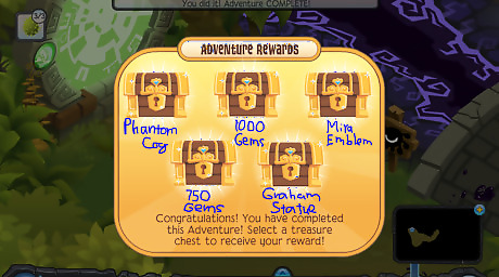 Speak to Cosmo and claim your prize. Cosmo will inform you that the volcano is the source of the raining sludge and that an eruption of the phantom volcano can mean the end of Jamaa. Claim your prize and exit the adventure. The prizes for easy mode are shown in the image.