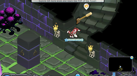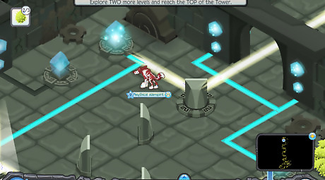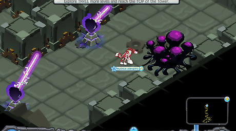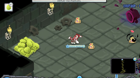 Escape the first level of the tower. Go through the gate. You'll enter a large room with phantom pods, a phantom watcher, and block pillars to help you dodge the laser. You can also use the phantom pods to help block the lasers. Escape past the laser to the far end of the room and go up the small staircase. Click on the lever to turn off the laser. Go up the staircase. Throughout the adventure, you'll find several clumps of phantom pods which you can destroy for courage and gems. However, it's best to destroy them after you turn off the laser in a tower level, as they can proof useful in blocking the lasers from reaching you. Phantom pod.png Some items increase the damage your animal makes even if they don't have an animation when you attack a phantom obstacle, such as spiked collars, stegosaurus tails, gazelle horns, etc. These items can also increase the damage of other items as well as deal damage of their own, even if they don't have an animation when you attack. A list of items like these can be found here.Screen Shot 2018 12 03 at 6.59.09 AM.png