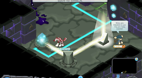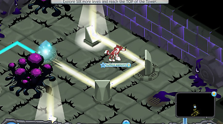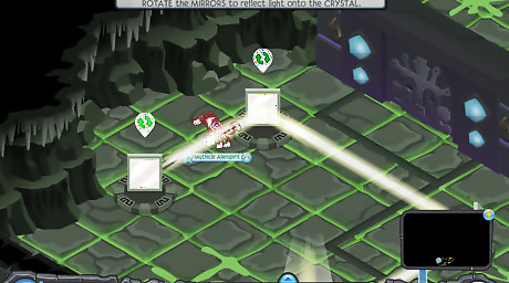 Take on the sixth level. On this level, there will be phantoms . Enter the room once the phantom moves out of the way and grab boomseeds from the bottom right corner of the room. Destroy the three phantoms and then solve the mirror puzzle. There are two main crystals that need to be lit up, but there's also one that doesn't contribute to unlocking the staircase that still needs to be lit up as well to solve the puzzle. Destroy the rock at the left with a boomseed that's blocking the light. Immediately, this should light up one of the crystals, but you'll still need to adjust it. Move to the bottom left mirrors. There will be two that are adjustable. Click on the top one three times. Then click the one below it three times as well. This will unlock the gate at the far right of the room. Adjust the mirror right in front of that gate three times. This will illuminate one of the main crystals. To light up the second main crystal, go down to the mirror shown in the image. Adjust it once and the gate will unlock. Go up the stairs. Anothermirror.png In easy mode, there is a Monkeys Only passage. In the process of solving this puzzle, you'll unlock a second gate at the far left of the room when the crystal that doesn't contribute to lighting the main gate is lit. Go through it and you'll find the Monkeys Only passage. Monkeys.png