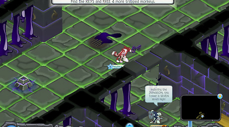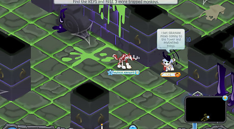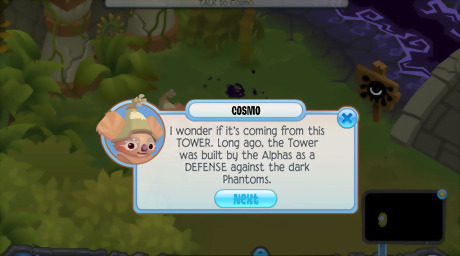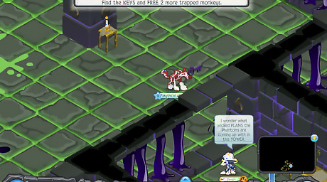 Talk to Cosmo. At the beginning of the adventure, you'll appear in a clearing with a bridge where it's raining phantom goop. Cosmo will tell you that long ago, the tower ahead of the bridge was built in favor of the Alphas, but the phantoms have taken it over. He tells you to get captured on purpose so that you can learn the secrets within the tower and free the trapped monkeys.