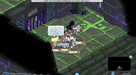 Hop on the Mira Emblem. Go up the large set of stairs in the main hall and hop on the Mira Emblem with the monkeys. The more players in the adventure with you are hopping, the faster the gate will open. Once the gate unlocks, enter the tower.