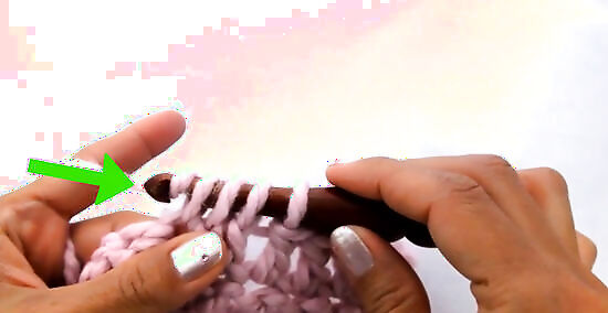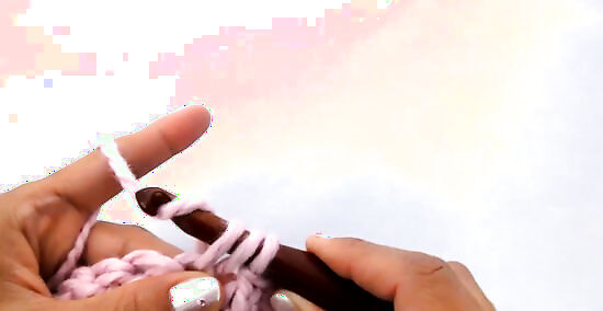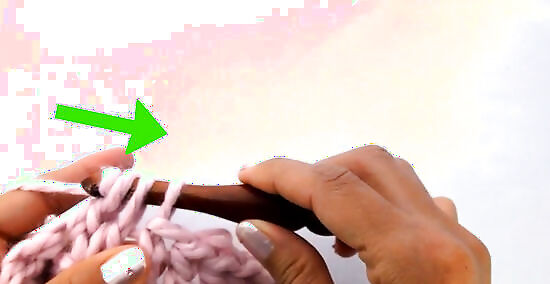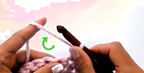 Yarn over. Like any double crochet, you need to start with a yarn over. You're probably a pro at yarning over by now, but in case you're not: With your current loop on the hook, pull the tail of the yarn up, behind the hook. Then pull it down over the front side of the hook, so that it lays over the shaft/throat, and tucks just under the actual hooked region. When you later pull the hook through a stitch, your yarn will come with it. This is called yarning over, and it's done from back to front as part of many crochet stitches. Once you get into your flow, you'll be able to yarn over with just a quick twitch of your hand and twist of your hook.