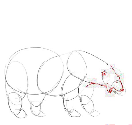 Draw the basic shapes for basis of our drawing. Sketch in a circle and an oval for the head (remember that that compared to most bears, polar bears have long snouts). Draw 2 large ovals for the body and a set of 2 ovals for each feet and don't forget to draw the paws.