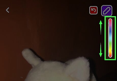 Press and hold the color slider to select a color. There are 33 colors available to choose from by pressing and holding the slider. Drag your finger across the selection to view the colors and select the one you want to use. The Pencil button will change to the color you have selected. On Android, the color slider will expand to show each distinct color available. On iOS, the color slider is a gradient rainbow, and slowly dragging your finger on it will allow you to see all of the different colors. On iOS, drag your finger all the way to the left side of the screen to select White, or all the way to the bottom of the screen to select Black.