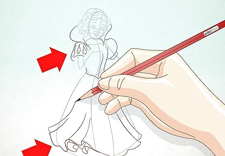 Detail the dress. Continue shaping the corset on the torso, and add movement to the skirt. The sleeves should be short and puffy. Put a big collar on the neck.