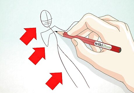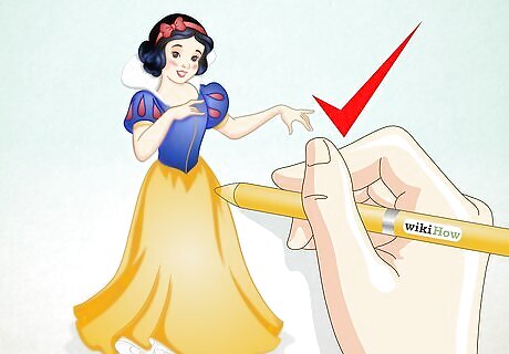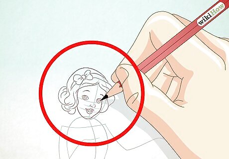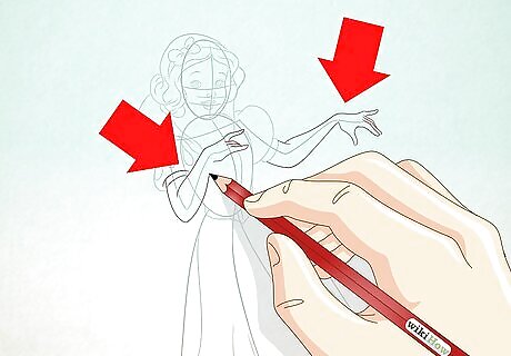 Sketch Snow White's body. Draw a vertical line with a curve where the bust will be crossed with a horizontal line for the arms. Draw an oval on either side of the horizontal line for the hands. On top of the vertical line, make an oval shape for the head. Draw a cross on the face to create guidelines for facial features later.