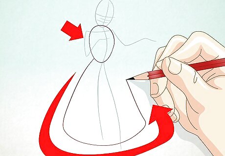 Draw an oval for the torso. Under that, draw a curvy skirt shape.