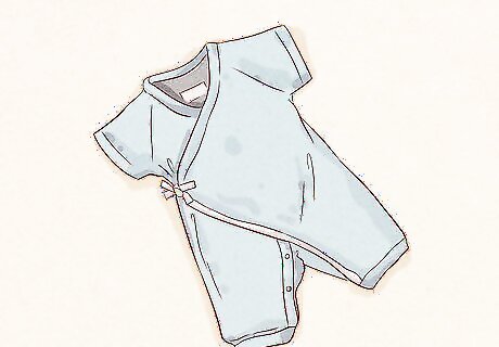 Select a fitted onesie or a wrap shirt as a base layer of clothing. Your newborn baby is not used to wearing clothes, and a onesie or a wrap shirt will stay in place and keep their tummy and back from being exposed. Plus, with the snaps at the bottom, you don’t have to completely undress your newborn when the inevitable diaper change comes around! A kimono, or wrap-style shirt opens across the front, so you don’t have to pull the garment over your newborn’s head when changing, which can cause many newborns to fuss. Depending on the temperature, one layer may be all you need. You can use a long-sleeved onesie and add pants to create a warm base layer. In temperatures 75 °F (24 °C) or above a short-sleeved base layer is best.
