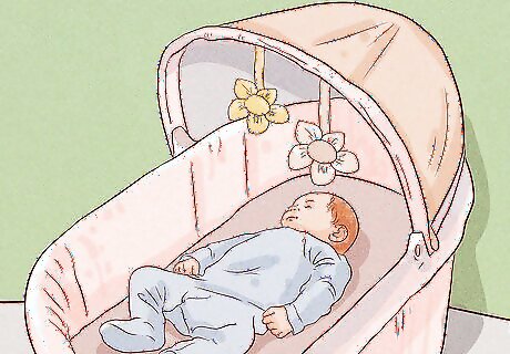 Create a safe sleeping environment. Safety is the most important factor for your sleeping newborn. A safe sleeping environment is one that is free of any potential health and safety risks. Suffocation, choking and SIDS are all concerns that you should consider when designating your child’s sleeping space. Choose a new crib or bassinet that meets the current safety standards. Choose a firm mattress and avoid soft mattress pads or memory foam. Only use tight-fitting sheets specifically designed for your mattress. Make sure there are no gaps between the mattress and the wall of the crib or bassinet. Make sure there are no extra blankets or accessories such as crib bumpers, pillows, wedges, or stuffed animals. Check for hazards such as curtain cords or baby monitor wires. Avoid letting pets, especially cats, near the sleeping space. While it is usually safe to use a pacifier for bed, never allow your newborn to fall asleep with a bottle. Newborns should always be placed on their back to sleep, even during nap times!