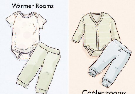 Choose a onesie and light pants during warm weather and a long-sleeved onesie and pants when it’s cold out. A base layer should be just that, a layer of clothes you put on your newborn before adding any additional garments. In warmer rooms, a short-sleeved onesie and light pants will provide enough warmth for your newborn. In cooler rooms, your newborn may need a long-sleeved onesie as a base layer. As a general rule, you should dress your baby in one more layer than what you would be comfortable wearing.