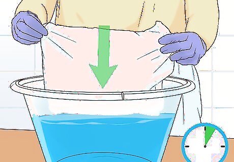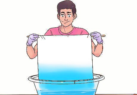 Submerge your tablecloth for 5-20 minutes to dye it all 1 color. Dunk the tablecloth into your bucket or bin, and use a spoon to push it beneath the liquid. This way, all of the fabric gets saturated in the dye. Leave the dye in the solution for 5-20 minutes, as outlined in your directions. Leave your tablecloth in the dye for a longer period of time for a highly saturated, vibrant look.