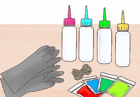 Mix the colors in a tie dye kit to prepare your dye. Included in these kits are gloves, rubber bands, applicator bottles, and dye pigments. Follow the included instructions regarding how to mix the dyes, as each type is slightly different. In general, you simply fill the bottles with water up to the fill line when you are ready to dye your tablecloth. You can purchase an at-home tie dye kit from most craft supply stores. 1 kit with 3-4 bottles should be enough dye for 1 tablecloth. Avoid overfilling the bottles, as you can lose pigment.