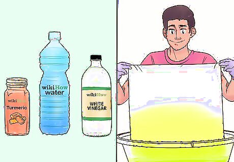 Use turmeric, water, and vinegar to dye your tablecloth yellow. Mix 4 c (950 mL) of vinegar with 16 c (3,800 mL) of water in a large pot, and turn your heat on medium. Place your fabric into the pot. As your fabric soaks, mix ¼ cup (59.15 g) of turmeric and 12 c (2,800 mL) of water and let it simmer. Let both pots sit for 1 hour with the heat on, and then dump out your vinegar mixture. Pour the dye over your fabric, and heat the fabric for 15-60 minutes. If you’d like, you can fold the tablecloth into a small bundle so it’s easier to fit in the pot. Fold the tablecloth lengthwise 2 times, then alternate your folds to create a square. After your fabric is folded, wrap rubber bands around it horizontally and vertically to keep it in place. The vinegar helps your fabric absorb the natural color.