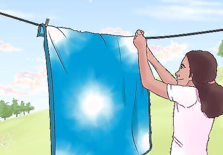 Let your fabric air dry for best results. Stretch your fabric out on a table, across your patio railing, or on a clean tarp. Then, let your tablecloth dry completely. After your fabric dries, you can place it on your table or wash it by itself if you'd like. Using heat when your tablecloth is first drying can release the natural dye pigment, making your tablecloth look faded more quickly. After you've let your tablecloth dry completely, then you can use heat on your fabric.